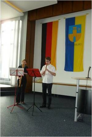 Bürgermeister Burkhard Deppe Prälat Bruno Kresing aus Paderborn StD iR Peter Möhring mit Gattin Schüler der Musikschule Bad Driburg geben mit ihren Musikbeiträgen der Feierstunde einen festlichen Rahmen Die Teilnehmer freuen sich, dass das Studienheim St. Klemens durch die Ausstellung im Rathaus neu ins Licht der Öffentlichkeit gerückt wird.